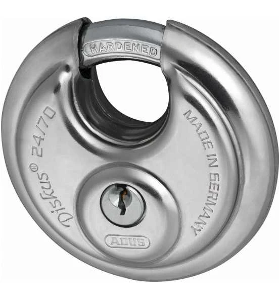 Die runde Form mit schmaler Bügelöffnung sowie die Schweißnaht sorgen für solide Sicherheit! Das Vorhangschloss Diskus 24/70 schützt Ihre Wertgegenstände, die Sie zum Beispiel in LKW, Transportern, Kellern oder hinter Fabriktoren lagern.