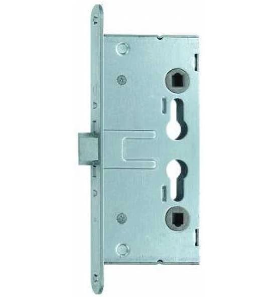 Dornmaß: 65 mm, Entfernung: 72 mm, Nuß: 9 mm, Stulp: 24 mm – rund – verzinkt, Falle und Riegel aus Metall, PZ-gelocht, mit Wechsel, ohne Schließblech.