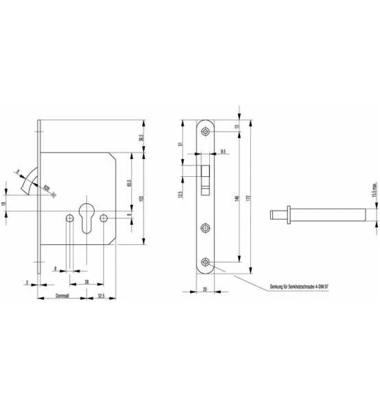 Ausführung mit Klappring-Schlüssel · allseitig geschlossener Schlosskasten · Stulplänge 172 mm · Dornmaß 55 mm · DIN links / rechts verwendbar · Zirkelriegel verchromt · ohne Schließblech · Klappring-Schlüsselausführung nur bei BB-Lochung Weitere technische Eigenschaften: · Ausführung: Zirkelriegel · Schlosskasten: allseitig geschlossen · Schlossriegel: verchromt