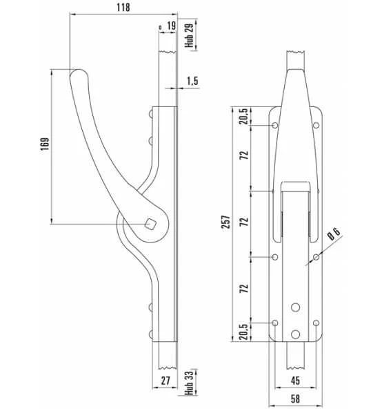 neutrales Design für alle baulichen Voraussetzungen · alle Kanten gerundet · für Vierkantstangen · Getriebekasten aus Stahl 1,5 mm tiefgezogen, galvanisch verzinkt · stabile Getriebeteile Weitere technische Eigenschaften: · Breite: 32,5mm · Anschlagrichtung: DIN links / rechts · Höhe: 118mm