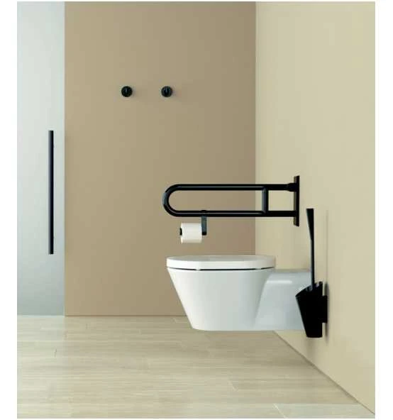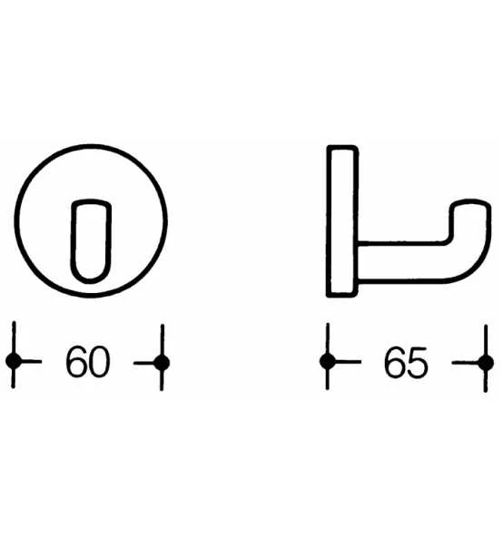 rechtwinklig gebogener, zylindrischer Haken mit Befestigungsrosette · der Haken dient zum Aufhängen von Kleidungsstücken und anderen Utensilien · leicht zu reinigen · diebstahlgeschützt durch verdeckte Verschraubung · 65 mm tief, Rosettendurchmesser 60 mm · aus hochwertigem Polyamid in ausgewählten HEWI Farben