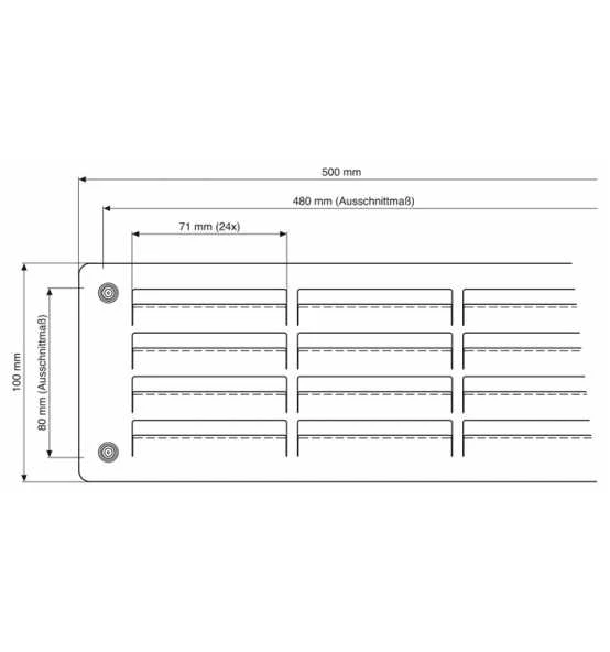 Stärke 1,5 mm · Luftdurchlass 207 cm² · nach hinten gekantete Lamellen 71 mm · Außenmaß 500 x 100 mm · Außenschnittmaß 480 x 80 mm Weitere technische Eigenschaften: · Türstärke max.: 60mm · Türstärke min.: 30mm