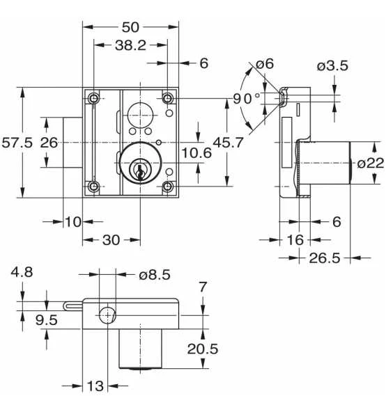 Aufliegend, mit Seitenriegel, mit Zylinder, Kasten Stahl, 2 Schlüssel, 1 Rosette,