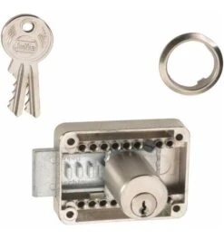 Aufliegend, mit Zylinder, Kasten Metall vernickelt, 2 Schlüssel, 1 Rosette, einstellbar von 15-40 mm bis Mitte