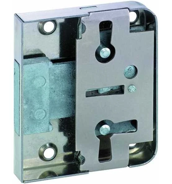 Aufliegend, mit „Dreizuhaltungsschließung“, Kasten Stahl vernickelt, rechts, links und auch unten (lad) verwendbar, 3 Zuhaltungen 1-6, 1 vernickelter Schlüssel, Bart 8 x 6 mm.