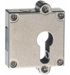 Kasten Metall vernickelt, PZ gelocht, rechts und links verwendbar, axial verstellbar, mit Anschraub-Ösen für Schlüsselschilder 7424 und 7425 (ohne Abbildung).