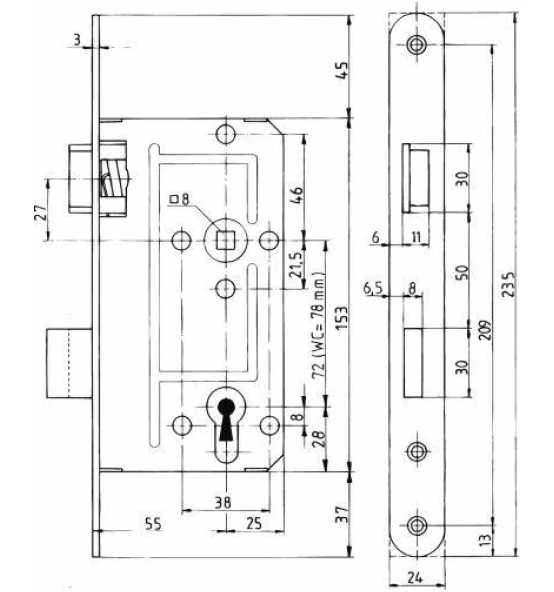 Für stumpfe Türen, 2-tourig, Dornmaß: 55 mm, Entfernung: 72 mm, Nuss: 8 mm, Falle und Riegel glanzverzinkt, mit Wechsel, ohne Schließblech. Stulp: 24 mm, käntig, altsilberfarbig lackiert, PZ.