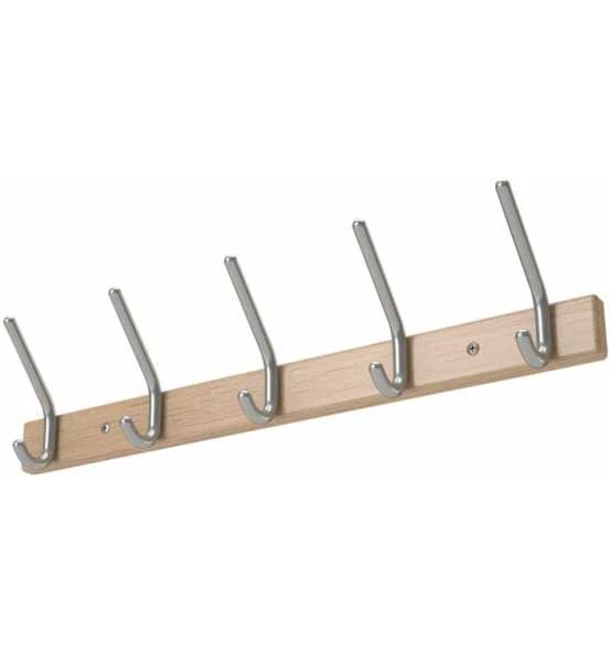 Garderobenblende aus Buche, 55 mm hoch, mit gerundeten Endabschlüssen, mit Aluminium Hut/Mantelhaken Ø 14mm, Hakenabstand ca. 150 mm, auf Holzprofil 60 x 20 mm massiv Buche lackiert Weitere technische Eigenschaften: · Befestigungsart: Wand · Farbe: Haken Alu · Ergänzung: Hakenabstand 150 mm · Höhe: 55mm